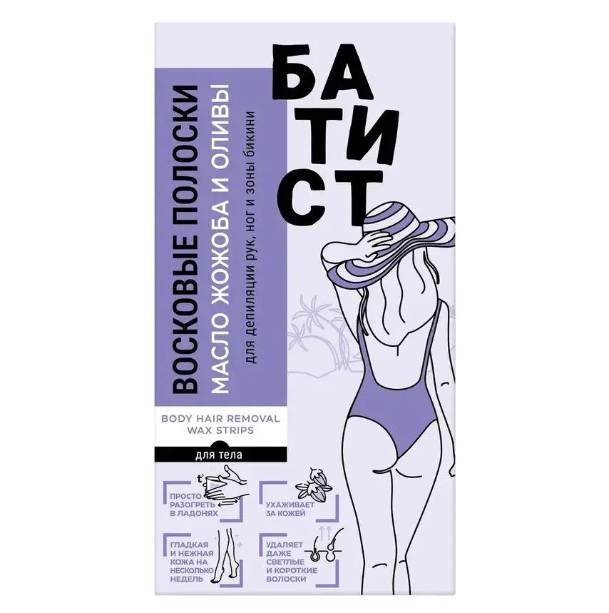 Восковые полоски для депиляции рук, ног и зоны биккини с маслом жожоба и оливы ТМ Батист деликатно и быстро удаляют даже самые короткие и тонкие волоски, нежно ухаживая за кожей. Состав на основе масел и экстрактов позаботится о защите вашей кожи во время процедуры, а так же минимизирует риск возникновения раздражения во время депиляции.