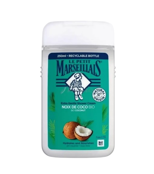 Особенности геля для душа «Кокос» от бренда Le Petit Marseillais: кокосовое масло помогает избавиться от сухости; обладает консистенцией умеренной густоты; имеет нейтральный рН баланс; протестирован дерматологами; образует густую и ароматную пену; эффективно и мягко очищает тело от загрязнений, излишков себума; нейтрализует неприятные запахи; подходит для ежедневного применения; предотвращает появление шелушений и ощущения стянутости; не оставляет после себя липкой или жирной пленки; тонизирует эпидермис; защищает от агрессивного влияния окружающей среды; подходит для всех типов кожи; дарит кожному покрову гладкость, мягкость и шелковистость; тонизирует эпидермис. Обладают мягким, не раздражающим действием, поэтому подходит для всех типов кожи, нейтральный рh, без сульфатов и парабенов. Этот гель обеспечивает мягкое очищение вашего тела, придавая ему ощущение свежести и комфорта. Он подходит как для женщин так и для мужчин.