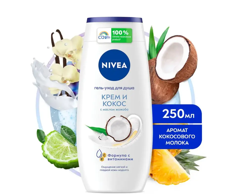 Попробуйте гель-уход для душа «Крем и Кокос» с маслом жожоба для всех типов кожи от NIVEA. Формула с витаминами С и Е защитит вашу кожу от сухости, а нежный аромат кокоса пробудит Ваши чувства и подарит ощущение заботы о Вашей коже. Превратите ежедневное принятие душа в момент истинного наслаждения и заботы о себе. Для ежедневного применения. pH-нейтрально для кожи. Дерматологически протестировано. Можно использовать с мочалкой для скрабирования кожи. Применение: нанесите гель для душа на тело, помассируйте и смойте водой комфортной температуры. Избегайте попадания в глаза. Нанесите бальзам, молочко или лосьон для тела от NIVEA на чистую и сухую кожу тела для дополнительного увлажнения.