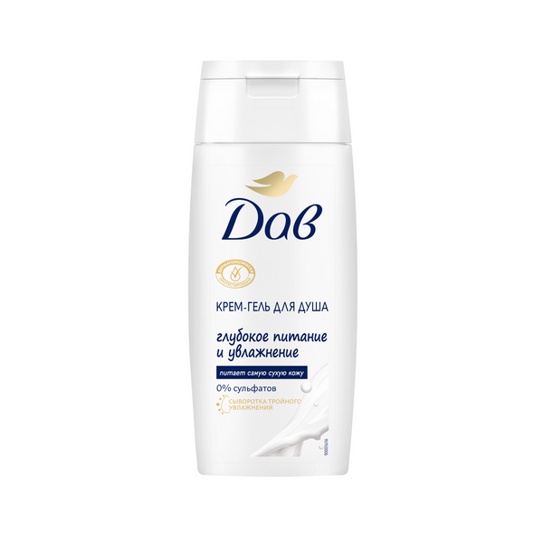 Попробуйте крем-гель для душа Глубокое питание и увлажнение Dove в тревел-формате 100 мл. Увлажняющая формула с сывороткой тройного увлажнения в его составе глубоко* и бережно очищает и питает даже самую сухую кожу. • В составе очищающие компоненты из природного сырья и увлажняющий компонент растительного происхождения. • 0% сульфатов SLES (содиум лаурет сульфат). • Подходит для всей семьи, в том числе детей с 4-х лет. • Гель для душа Dove создает гигантское облако пены всего от одной капли и бережно очищает кожу. • Крем-гель обладает роскошным уходовым ароматом, благодаря которому обычный прием душа станет небольшим спа-ритуалом и временем, посвященным себе и своей красоте. Результат: мягкая, увлажненная кожа за 1 применение***.
