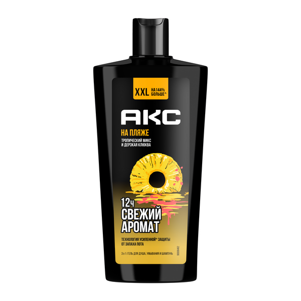 Встречай крутую новинку от Акс - средство для личной гигиены На пляже с топовым* ароматом. Продукт 3в1 одинаково хорош как шампунь для волос, средство для умывания лица и гель для душа. Мужской шампунь 3в1 имеет яркий фруктовый аромат, на создание которого нас вдохновил известный хит - популярный тропический коктейль. Основа аромата - ТРОПИЧЕСКИЙ МИКС И ДЕРЗКАЯ КЛЮКВА. Притягательные ноты клюквы, сочного ананаса и яркого апельсина передали новому аромату Акс свой страстный характер. Гель для умывания лица 3в1 На пляже дерматологически протестирован. Гель для душа и шампунь мужской - верное решение для тех, кто хочет выглядеть на 100%, тратить минимум времени и не загромождать ванную комнату флаконами. Парфюмированный гель для душа мужской разработан на основе технологии усиленной* защиты от запаха пота на протяжении 12 часов'. Гель для душа 3в1 мужской На пляже эффективно смывает бактерии, очищает кожу. Шампунь 3в1 мужской содержит пребиотики растительного происхождения'', а также увлажняющие ингредиенты. Объем 610 мл XXL на 144% больше^, а значит, вам его хватит надолго