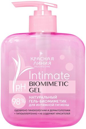 Натуральный гель-биомиметик для интимной гигиены от бренда Красная Линия, обладает pH-сбалансированной формулой, подойдет для обладательниц чувствительной и склонной к появлению раздражений кожи.