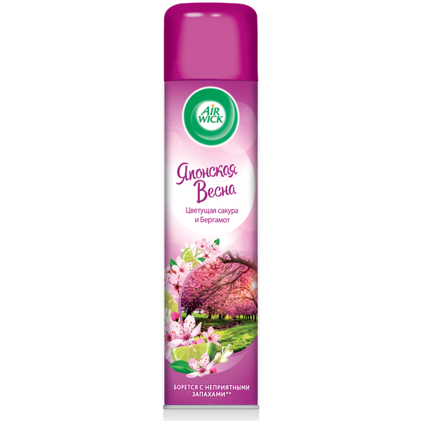 Аэрозоль-освежитель воздуха Air Wick Японская весна из новой коллекции Ароматы мира эффективно борется с неприятными запахами, создавая весеннюю атмосферу с нежными ароматами цветущей сакуры и бергамота.