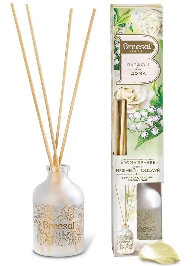Диффузор ароматический для дома Breesal – это многогранный аромат в стеклянном флаконе, который впишется в любой интерьер и создаст в нем особую атмосферу. Аромат, в основе букета которого легкая деликатная белая роза, дополнен свежестью зеленого чая и нежной нотой ландыша. Необычные аромакомпозиции от ведущих парфюмерных домов мира дополнены натуральными эфирными маслами с антибактериальными свойствами. Просто откройте флакон и опустите палочки в ароматический диффузор для дома. Сделанные из натурального ротанга, они быстро наполнятся жидкостью и будут отдавать аромат медленно и равномерно, поэтому вы сможете наслаждаться им до 30 дней. Регулировать интенсивность ароматизатора для дома можно добавлением или уменьшением количества палочек. А если аромат станет менее ощутим, достаточно перевернуть палочки во флаконе. Попробуйте и другие ароматы для дома от Breesal из линейки ароматических диффузоров с палочками.