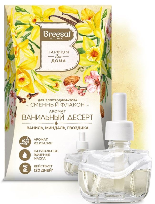 Сменный флакон с ароматической жидкостью для электрического диффузора Breesal: "Ванильный десерт".Назначение: для устранения неприятных запахов, освежения и ароматизации воздуха жилых помещений, ванных и туалетных комнат