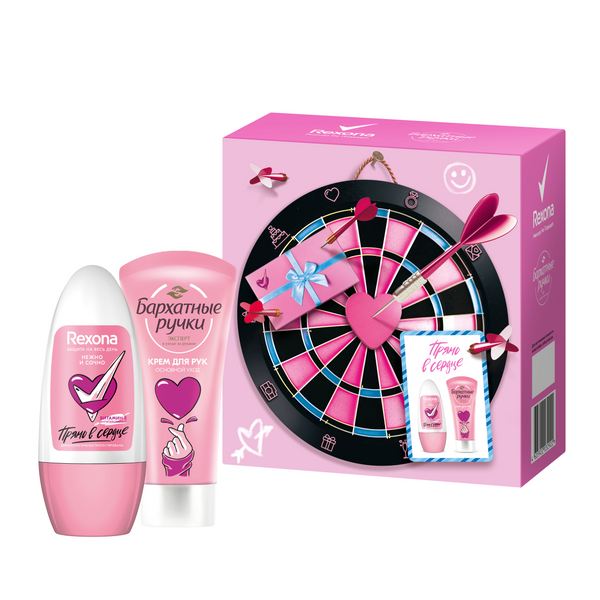 Идеальный презент для юных красоток, который пригодится на каждый день – подарочный набор Прямо в сердце от брендов Rexona и Бархатные ручки! Стильная упаковка в розовом цвете и яркие ароматы продуктов доставляют особое удовольствие во время использования. Создан, чтобы поднять настроение подруге или сестре. Подарочный набор Прямо в сердце от коллаборации Rexona и Бархатные ручки – отличный подарок для вас и прекрасной. Шариковый антиперспирант Нежно и сразу Rexona надежно защищает от пота и неприятного запаха до 48 часов*. Благодаря комплексу активных компонентов с витамином Е**в составе он ухаживает за нежной кожей подмышек, создает комфорт весь день. Невидимая защита не оставляет пятен, а сочный фруктовый аромат добавляет настроению свежести. Аромат с нотками цитрусовых, арбузы и спелого яблока дополнен аккордами клубников и красной малины, усиленными успехами розового грейпфрута. Чистоты формы, тонкие, тонкие розовые шлейфы, а его цветочное сердце прекрасно дополняет ванильно-мускусный бэкграунд. Не содержит этиловый спирт и парабены. Крем для рук Основной уход от Бархатные маски бренда подходят даже для сухой кожи, действуя как увлажняющий и питательный. Его формула обогащена алоэ вера и другими активными ингредиентами. Объем 45 мл позволит взять его с собой куда угодно и использовать по мере необходимости.