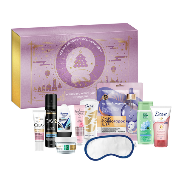 Отличный способ подарить себе праздничное настроение и познакомиться с красотой от любимых брендов. В подарочный набор для женщин входят уходовые средства семи брендов: Чистая Линия, Бархатные Ручки, Rexona, Dove, TRESemme, Черный Жемчуг и Clear. - Крем-флюид для лица Pure Line от бренда Чистая Линия дарит ощущение комфорта без раздражения, делает кожу более упругой, увлажняющей, свежей и отдохнувшей, сохраняет жирный блеск. - Крем для увлажнения женщин. Бархатные ручки питают, восстанавливают, смягчают кожу, помогают бороться с шелушением и другими воздействиями сухости кожи. - Антиперспирант женский шариковый Rexona Прозрачный кристалл защищает от пота и запаха в течение 72 часов и сохраняет ощущение свежести после мытья. - Крем-гель для умывания лица Dove Ухаживающий эффективно очищает и одновременно увлажняет кожу, восстанавливает и поддерживает липидный барьер. - Крем для рук Dove с кокосом и миндалем дарит коже восхитительное увлажнение и мягкость, ухаживает и питает кожу рук. - Сухой шампунь для женских волос TRESemme Volume мгновенно освежает прическу и легкий воздушный объем от самых корней. Сухой шампунь можно использовать и на чистых волосах в качестве бустера для мгновенного объема! - Лосьон-тоник для лица женский Чистая Линия освежает, тонизирует и увлажняет кожу, подготавливая ее к нанесению крема или базы под макияж. - Маска для лица тканевая с эффектом лифтинга Черный Жемчуг помогает бороться с возрастными изменениями, активно питает и смягчает кожу. - Скраб для кожи головы Clear Derma Therapy Энергия роста очищает и отшелушивает ороговевший слой эпидермиса, обновляя кожу. - Также в набор подарочный бонус входит маска для сна женская, разработанная брендом Dove. Адвент-календарь станет в качестве подарка маме, женщине, девушке и подруге. Порадуйте близких подарком на Новый год или купите себе набор, чтобы насладиться качественным и комплексным уходом за волосами и кожей!