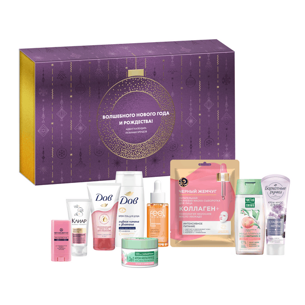 Подарочный набор для женщин косметический Календарь Адвента с косметикой представляет собой уходовый бьюти-бокс, в котором собраны средства 6 любимых брендов. Эта эксклюзивная коллекция* косметических продуктов предлагает все необходимое для комплексного ухода за кожей лица, рук, тела и волос. Любимые бренды, собранные вместе, дарят праздничное настроение и дают возможность познакомиться с лучшими средствами для красоты. * Изысканный подарочный набор в стильной и огненной коробке, что делает его новогодним сюрпризом. Он подойдет любой женщине или девушке, которая заботится о качественном уходе за собой и желает попробовать новые бьюти-продукты. - Мицеллярная вода для снятия макияжа с глаз и лица Чистая Линия подходит для кожи любого типа, легко и бережно снимает макияж, обеспечивает мгновенное увлажнение и смягчение кожи, оказывает успокаивающий эффект. - Крем-гель для умывания ухаживающий Дав с гиалуроновой кислотой и церамидами обеспечивает коже ультрамягкое очищение*, не сушит и не стягивает кожу после нанесения, специальные мягкие шарики в составе средства обладают нежным отшелушивающим эффектом. - Сыворотка для текстуры лица, увлажняющая FEEL MOMENT с витамином, спортивным тоном и кожей, нежное, естественное, естественное сияние и увлажняет ее, поддерживает здоровье и защищает барьер. - Сыворотка для век и губ с антивозрастным эффектом Черный Жемчуг в формате стика интенсивно питает и увлажняет кожу, поднимает ее взглядом и тонизирует, а также сокращает морщины и покраснения. - Маска для лица тканевая Черный Жемчуг с коллагеном поднимается, упругость и упругость кожи, насыщенно питает и увлажняет ее, разглаживает морщинки и создает ощущение сухости, стянутости. - Крем для лица увлажняющий Чистая Линия с экстрактом розы и витаминами С и Е подходит для любого типа кожи, сочетается с собой сразу три средства: крем, маска для лица и основа под макияж. Его сбалансированная текстура мгновенно впитывается, не оставляя липких следов и жирного блеска. - Шампунь для женских волос Клиар DERMA THERAPY с коллагеном, биотином и витамином В3 сокращает выпадение и восстанавливает структуру волос, уплотняет и мягко ослабляет истонченными и ослабленными локонами. - Крем-гель для душа бережно очищает и глубоко питает кожу, смягчает и увлажняет ее всего за 1 применение, а также экономно расходуется, образуя пышное облако пены всего от одной капли. Не содержит в составе сульфатов SLES/SLS (лаурет/лаурилсульфат натрия). - Крем для рук Парфюмированные Бархатные ручки с маслами ши и миндаля интенсивно смягчает, питает и увлажняет сухую кожу рук. Его нежная муссовая текстура прекрасно впитывается, не оставляя липкости и жирности. - Также в бьюти-бокс для женщин входит приятный бонус — набор стикеров. Календарь Адвента с косметикой для женщин - это оригинальный и полезный подарок на Новый год или Рождество подруге, любимой маме или бабушке. Его можно купить и подарить взрослой сестре,Учителю или коллеге, жене или крестной как новогодний подарок. Благодаря компактному формату эти средства для ухода легко помещаются в косметичку или сумку, что позволяет их смазывать спутниками в дороге, путешествии и отпуске. Они не придерживаются большого количества мест и отдают предпочтение красоте кожи и волос в любых условиях. 'из-за ломкости.