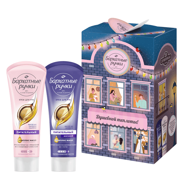 Изысканный подарочный набор для женщин и девушек Бархатные Ручки С теплотой для тебя — это идеальный выбор для тех, кто стремится обеспечить своим рукам полноценный и качественный уход. В этом стильном подарочном наборе представлены средства как для дневного, так и для ночного ухода за кожей рук, что делает его незаменимым помощником в сохранении красоты и нежности женских ручек. Крем для рук увлажняющий и питательный с маслом ши и гиалуроном уже с 1 применения глубоко питает* и восстанавливает эпидермис. Он эффективно устраняет 5 основных проблем сухости кожи: стянутость, шелушение, шероховатость, потерю влаги и снижение упругости. Его нежный аромат со сливочно-древесными нотами подарит особое удовольствие во время использования. Наносите питательный крем для рук, ногтей и кутикулы после маникюра, каждый раз после мытья и перед выходом на улицу. Крем для рук восстанавливающий ночной с маслом ши и коллагеном за 1 ночь эффективно восстанавливает кожу.' Комплекс масел в его составе интенсивно смягчает и предотвращает появление нежелательной сухости кожи. Чувственный аромат с мягкими мускусными нотами создает особую атмосферу, помогая расслабиться и насладиться моментом ухода за собой. Кремы для рук обладают насыщенной, но при этом легкой текстурой, которая быстро впитывается, не оставляя после себя ощущения липкости или жирной пленки. Они придают рукам ухоженный вид, обеспечивая интенсивное увлажнение, питание, восстановление и смягчение кожи.