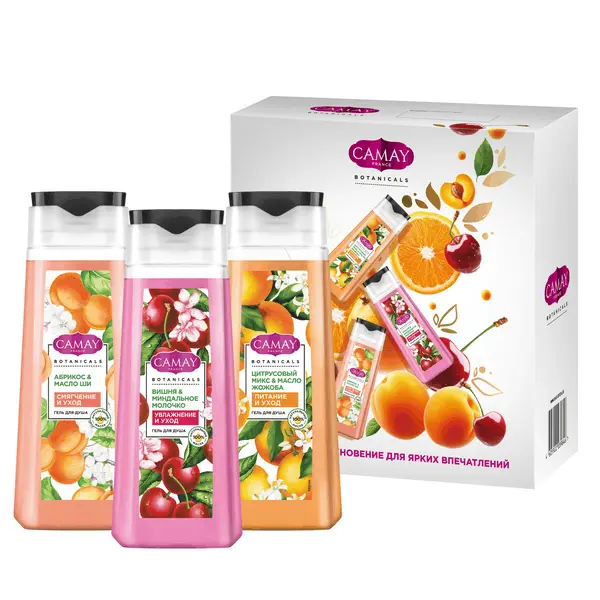 CAMAY Подарочный набор уходовой косметики для женщин Фруктово-цветочный букет — это отличный выбор для презента на любой праздник и просто так. Если вы не знаете, какой сюрприз преподнести своей знакомой, подруге или родственнице, то обязательно присмотритесь к этому набору уходовых средств. В комплект входят три геля для душа: Вишня и миндальное молочко; Цитрусовый микс и масло жожоба; Абрикос и масло ши. Гель для душа женский парфюмированный с гурманским вишневым ароматом поможет снять напряжение и нежно очистит кожу. Чувственный запах спелой вишни с терпкой кислинкой не оставит вас равнодушной, позволит создать романтическое настроение. Продукт содержит 100% натуральные масла, миндальное молочко, витамины А и Е. Миндальное молочко глубоко* увлажняет и успокаивает кожу, оказывает тонизирующее действие. Можно использовать гель и как пену для ванны: его воздушная текстура и нежный аромат наполнят пространство духом умиротворения и уюта. Гель для душа ароматизированный с ярким цитрусовым ароматом идеально подходит для вечернего принятия ванны, поскольку создает атмосферу расслабления и блаженства после насыщенного дня. Средство содержит 100% натуральные масла макадамии и жожоба для полноценного питания кожи и ухода за ней во время мытья. Масло жожоба содержит витамин E и другие антиоксиданты, комплексно воздействует на кожу: смягчает и питает ее. Благодаря содержанию липидов масло жожоба препятствует потере кожей влаги, защищает ее от пересыхания. Парфюмированный гель для душа женский с ароматом нектара спелых медовых абрикосов отлично пенится, смягчает кожу и ухаживает за ней. Парфюмерный гель для душа женский содержит 100% натуральные масла ши и макадамии. Масла комплексно воздействуют на кожу, смягчают ее, повышают ее эластичность. Можно купить бьюти бокс для женщин подарочный своей маме и подруге. * в пределах рогового слоя.