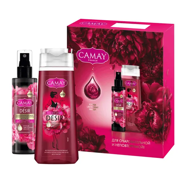 CAMAY Подарочный набор уходовой косметики для женщин — это отличный выбор для презента на любой праздник и просто так. Если вы не знаете, какой сюрприз преподнести своей знакомой, подруге или родственнице, то обязательно присмотритесь к этому набору уходовых средств. В комплект входят два эффективных продукта: гель для душа и спрей-мист для тела и волос парфюмированный. Camay гель для душа женский парфюмированный ВОСХИТИТЕЛЬНОЕ ОЧАРОВАНИЕ имеет состав, обогащенный цветочными маслами: лаванды, иланг-иланга и душицы. Камей гель для душа ароматизированный имеет стойкий аромат пиона и красных ягод, который сохраняется на коже до 8 часов*. Наши эксперты вдохновились феноменально** популярным парфюмом Baccarat rouge 540. Так появился парфюмированный женский гель для душа Камей. Пион, османтус и фрезия представляют собой верхние ноты парфюма, плавно переходящие в сердце композиции – сочные красные ягоды (вишня и клубника). Завершающие акценты обволакивающего кашемира и белого кедра стали шлейфом, послевкусием данного аромата. Спрей-мист для волос и тела парфюмированный имеет приятный аромат пиона, клубники и вишни, который сохраняется на коже до 12 часов***.