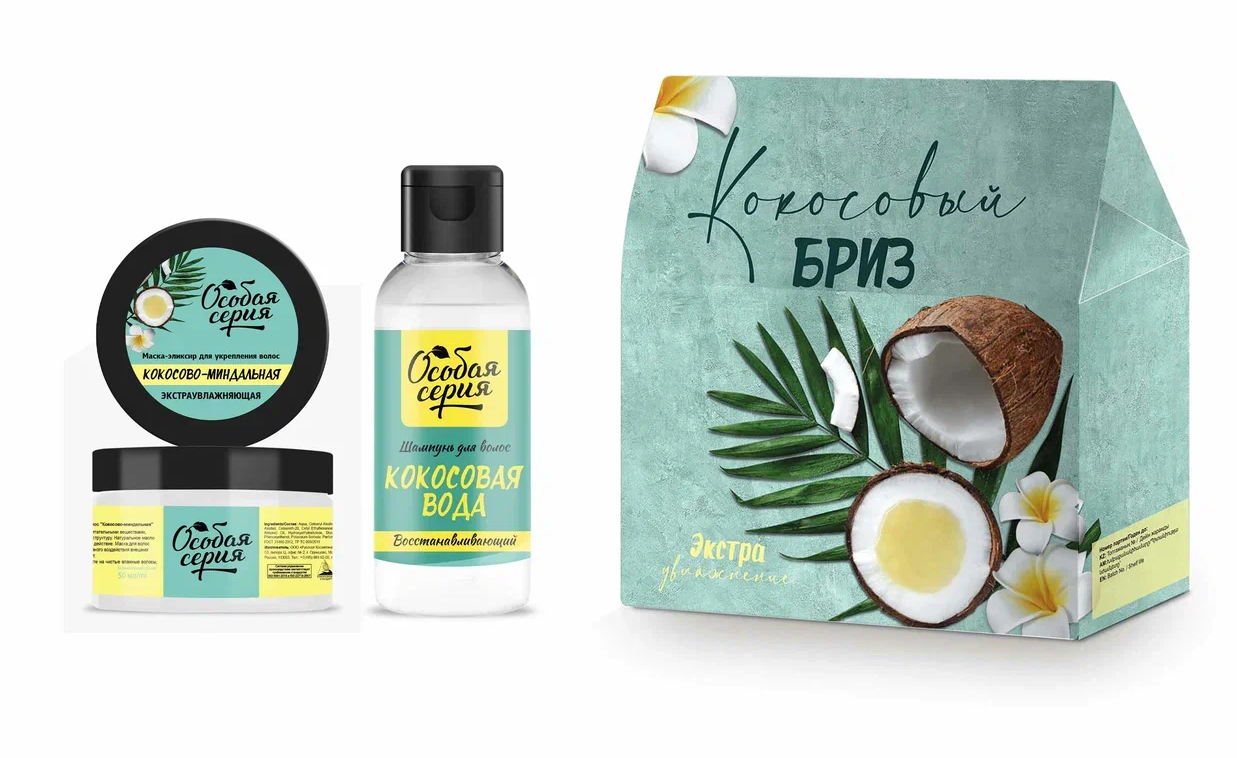 Подарочный набор кокосовый бриз шампунь для волос кокосовая вода 150 мл маска эликсир для укрепления волос кокосово миндальная 100 мл