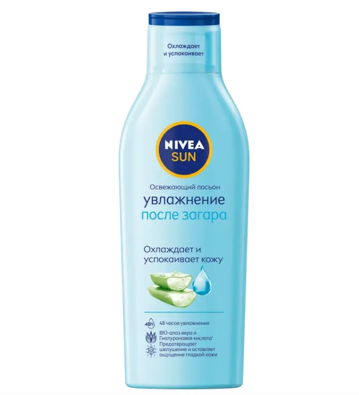 Увлажняющий лосьон для тела NIVEA Sun с био-Алоэ Вера и гиалуроном. Успокаивает и увлажняет на 48 часов, легкая формула не оставляет липкости на коже.