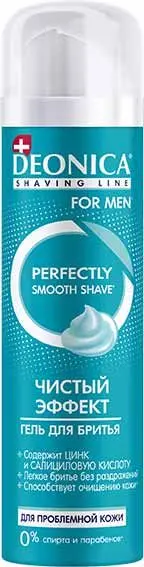 Специальная формула с Цинком и Салициловой кислотой обеспечивает комфортное бритье и уход за проблемной кожей. Подходит как для бритья, так и для умывания. Для лучшего эффекта рекомендовано использовать вместе с лосьоном после бритья DEONICA FOR MEN Чистый эффект.;Смочите кожу водой. Выдавите гель на ладонь. Равномерно нанесите гель для бритья на кожу.После процедуры бритья или очищения кожи смойте остатки геля водой.; Не распылять вблизи открытого огня и раскалённых предметов! Предохранять от воздействия прямых солнечных лучей и нагревания выше 50 ºС.Не разбирать и не давать детям! Баллон находится под давлением! Не наносить на поврежденную или раздраженную кожу..Избегать попадания в глаза! При попадании пены в глаза тщательно промыть их водой.Распылять при температуре не ниже +10ºС.Не курить во время использования. После использования или по окончании срока годности продукцию утилизировать как бытовой отход. ОГНЕОПАСНО!