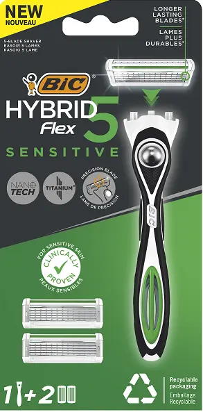 Hybrid 5 Flex Sensitive - лучшее бритьё от BIC, специально создана для чувствительной кожи. 5 нанотехнологичных подвижных лезвий этой бритвы индивидуально подстраиваются под контуры вашего лица, обеспечивая сверхтщательное и гладкое бритьё, а дополнительное лезвие-триммер позволяет добиться высокой точности даже в труднодоступных зонах. Увлажняющая полоска, обогащенная витамином Е, алоэ вера и лакрицей, клинически доказала свою эффективность для чувствительной кожи и помогает защитить ее от раздражения. Благодаря утяжеленной ручке с балансирующей сферой и плавающей головке, поворачивающейся на 40 градусов, вам обеспечено ещё больше контроля. В комплекте этой мужской бритвенной системы - эргономичная ручка и две сменные кассеты. Теперь в перерабатываемой упаковке!