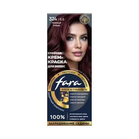 Крем-краска FARA тон «Темный рубин» 324 создает насыщенный, глубокий оттенок с бархатистым блеском. Формула обеспечивает стойкость цвета и уход за волосами.