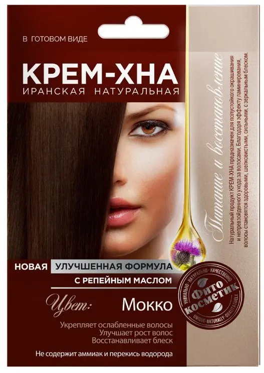 Инновационный прорыв в сфере окрашивания волос. Это натуральная природная краска, обогащенная репейным маслом, дарит волосам глубокий, сияющий цвет «Мокко», интенсивно питает, увлажняет, восстанавливает и оздоравливает их. Наполняет жизненной силой и энергией от корней до кончиков волос, придает ослепительный блеск и объем. Репейное масло усиливает капиллярное кровообращение в коже головы, питает и укрепляет корни и структуру волос. После использования крем-хны в готовом виде, волосы приобретают красивый насыщенный цвет, становятся более густыми, эластичными, упругими и шелковистыми и послушными.