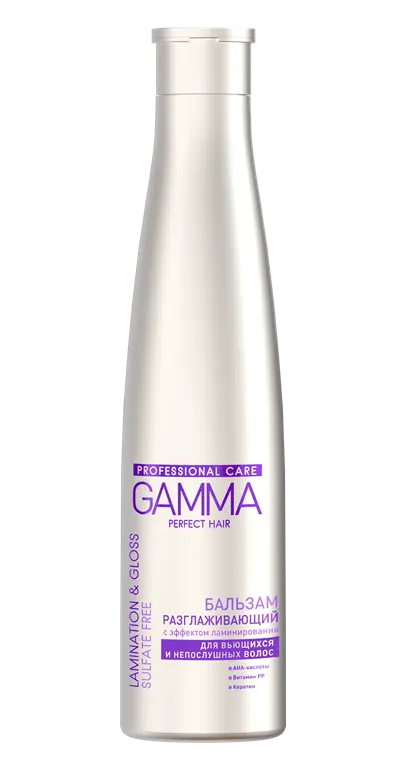 Бессульфатный бальзам GAMMA Разглаживающий с эффектом ламинирования идеально подходит для волос после процедуры ботокса или кератинового выпрямления, позволяя надолго сохранить эффект глянцевых ламинированных волос.