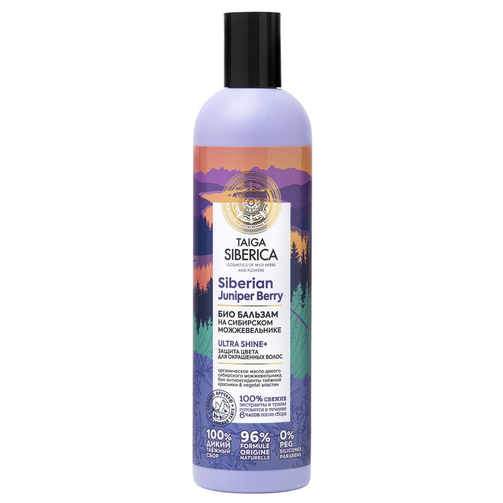 Био бальзам защита цвета для окрашенных волос ULTRA SHINE+ Siberian Juniper Berry Интенсивно увлажняет тусклые в результате окрашивания волосы, возвращает им роскошный сияющий блеск. Надолго сохраняет яркость и насыщенность цвета, препятствуя вымыванию пигмента. - Предотвращает спутывание волос - Защищает от негативных воздействий окружающей среды - Эффект натурального ламинирования ДИКИЙ СИБИРСКИЙ МОЖЖЕВЕЛЬНИК — ДРЕВНЕЕ И МИСТИЧЕСКОЕ РАСТЕНИЕ ТАЙГИ Органическое масло дикого сибирского можжевельника содержит максимум AHA-кислот и витамина С, усиливающих яркость цвета и блеск. Высокое содержание воска и смол создает эффект биоламинирования, обволакивая и восстанавливая структуру волос. Таежная красника богата антиоксидантами, эффективно тонизирует, укрепляет и возвращает жизненные силы волосам после окрашивания, а также защищает от негативного воздействия окружающей среды. Vegetal эластин содержит необходимые волосам аминокислоты, придает волосам упругий объем без утяжеления, эластичность и яркость цвета.