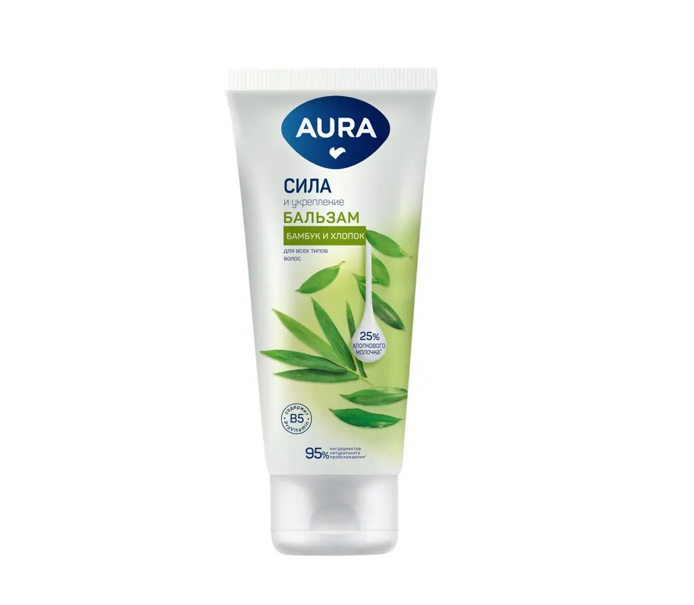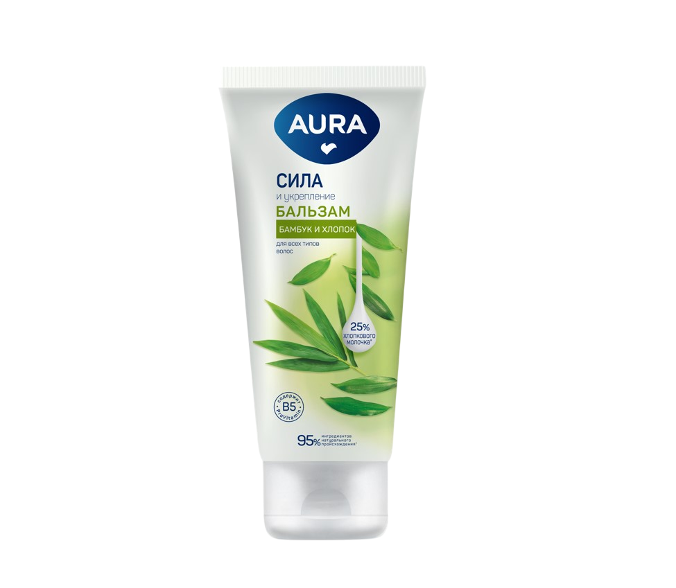 Бальзам AURA Сила и укрепление идеально подходит для ухода за всеми типами волос. Выравнивает структуру волос, делает их блестящими и шелковистыми, облегчает расчесывание. Глубоко проникает в структуру волос и укрепляет их по всей длине, придавая им особую силу и прочность без утяжеления. ЭКСТРАКТ БАМБУКА придает волосам больше упругости, увлажняет, тонизирует и укрепляет структуру волос, стимулируя их рост. ПРОВИТАМИН В5 восстанавливает поврежденную структуру волос, глубоко питает и разглаживает их. ХЛОПКОВОЕ МОЛОЧКО легко проникает в структуру волос, нежно ухаживает за ними и придает особую мягкость и блеск. Бальзам на 95% состоит из ингредиентов натурального происхождения. Благодаря АКТИВНОЙ ФОРМУЛЕ ТРОЙНОГО УХОДА волосы становятся сильными и крепкими при его регулярном использовании. Для наилучшего эффекта рекомендуем использовать вместе с шампунем AURA Сила и укрепление.