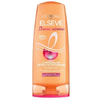 Супербальзам Легкое Расчесывание Elseve, Длина Мечты, для длинных поврежденных волос. Уникальная формула Супербальзама Легкое Расчесывание Elseve, Длина Мечты от L'Oreal Paris мгновенно распутывает ваши волосы и препятствует ломкости. Она обогащена питательным коктейлем ингредиентов, известных своими полезными свойствами: растительный кератин восстанавливает ваши волосы до самых кончиков; витамин В5 укрепляет волосы; касторовое масло глубоко питает и дарит блеск. Способ применения: Наносите бальзам Эльсев от Лореаль Париж только по длине волос, чтобы не утяжелять их у корней. Нанесите на влажные волосы после использования шампуня, распределите по всей длине до самых кончиков, затем смойте. Для идеального результата используйте также Шампунь Преображение и Крем-Уход Нет Ножницам гаммы Длина Мечты. При попадании в глаза немедленно промойте водой.