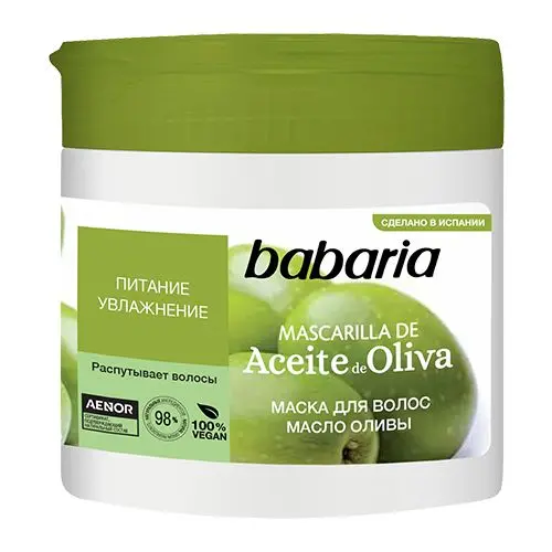 Маска для волос Babaria. Средство питает, укрепляет локоны, придает гладкость и послушность, распутывает пряди. Состав обогащен маслом оливы. Действующий ингредиент интенсивно увлажняет, защищает от агрессивного воздействия внешней среды, восстанавливает структуру. После применения маски волосы обретают естественный блеск, легче расчесываются.Подходит для всех типов волос. Рекомендуется использовать вместе с оливковым шампунем от Babaria. Маска на 98% состоит из натуральных компонентов.