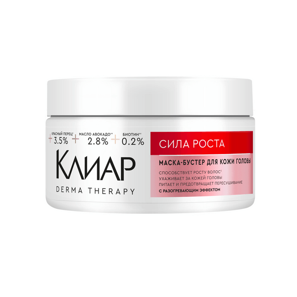 Маска-бустер для роста волос с экстрактом красного перца Клиар Derma Therapy Сила роста - это эффективное средство-новинка, созданное специально для интенсивного ухода за ослабленными волосами в прикорневой зоне. Насыщенная формула средства для роста волос на голове у женщин обогащена экстрактом красного перца 3,5 %’, маслом авокадо 2,8 %’’ и биотином 0,2 %’’. Формула с красным перцем активизирует питание кожи головы, способствуя росту волос [1]. Масло авокадо и биотин ухаживают за кожей головы и волосами в прикорневой зоне, борясь с сухостью*. Питательная маска для кожи головы с красным перцем обеспечивает укрепление и питание локонов, предотвращая их пересушивание у корней. В результате волосы становятся более сильными, а кожа головы — здоровой на вид. Активатор роста волос с разогревающим эффектом подходит для всех типов волос, включая сухие и поврежденные. Разогревающая перцовая маска способствует росту волос [1], делая пряди более сильными.