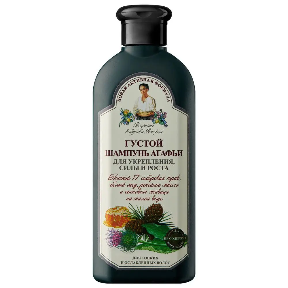 Густой шампунь Агафьи для укрепления, силы и роста волос создан на настое сосновой живицы на талой воде, сбора 17 сибирских трав, с добавлением белого меда и репейного масла. Содержание в шампуне талой воды обеспечивает щадящую основу для мытья, настой трав, белый мед, репейное масло служат увлажнением и питанием слабому волосу, укрепляют и стимулируют его рост. Сочетание активных питательных компонентов дарит вашим волосам комплексную заботу: укрепление, силу и рост.