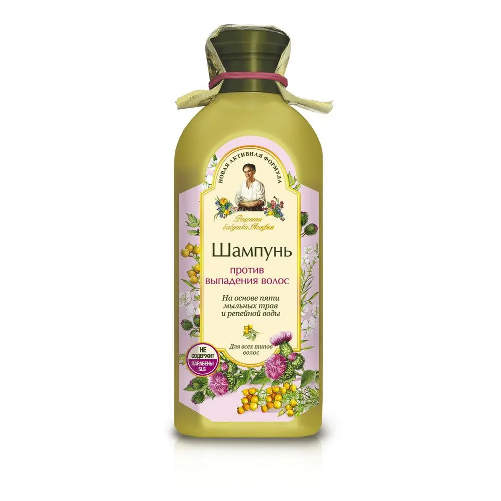 Шампунь против выпадения на основе пяти мыльных трав и репейного настоя для всех типов волос. Репейный настой, входящий в состав шампуня, питает кожу головы и укрепляет волосяные луковицы. Специально отобранные травы и активные компоненты регулируют выработку ферментов и предотвращают выпадение волос. Натуральная вспенивающая основа на пяти мыльных травах (солодка уральская, амарант, качим сибирский, истод и красный мыльный корень) мягко очищает волосы и кожу головы.