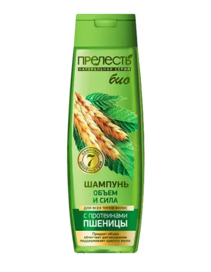 Шампунь для всех типов волос ПРЕЛЕСТЬ БИО «Объем и сила» содержит ухаживающий комплекс «7 целебных трав» (сочетание ромашки, крапивы, хмеля, розмарина, хвоща, мелиссы и шалфея), который способствует питанию, укреплению волос, защите их структуры от повреждения, сухости и ломкости, придает блеск и гладкость, бережно ухаживает за кожей головы. Экстракт ростков пшеницы делает волосы до 70% более объемными, густыми и блестящими. Шампунь кондиционирует волосы, восстанавливает силу и упругость.