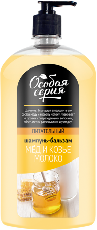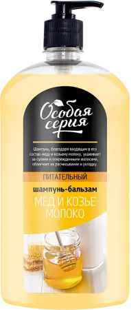 Шампунь-бальзам Особая серия, благодаря входящим в его состав меду и козьему молоку, превосходно ухаживает за сухими и поврежденными волосами, облегчает их расчесывание и укладку.