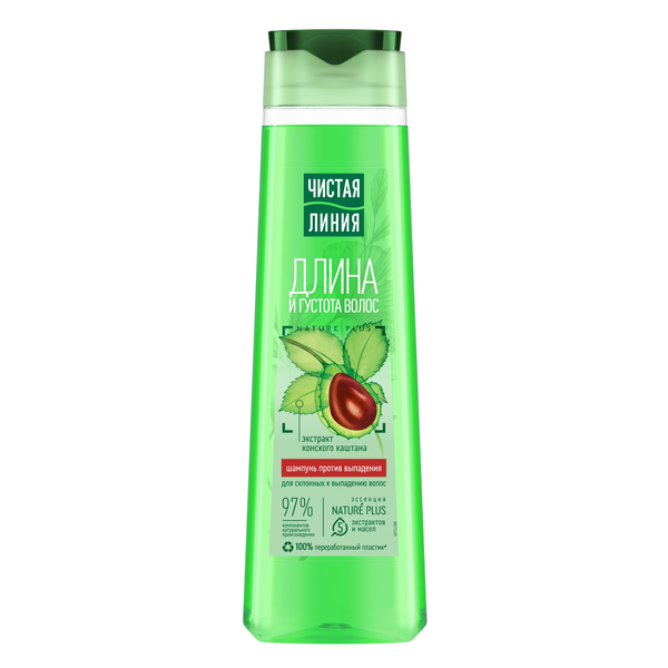 Новая формула шампуней ЧИСТАЯ ЛИНИЯ создана для видимой СИЛЫ и ГУСТОТЫ волос. Технология биоферментации делает привычные натуральные компоненты до 60 раз эффективнее. Волосы становятся плотнее и гуще по всей длине. Шампунь Против выпадения для усталых, склонных к выпадению волос, содержит отвар целебных трав, который питает корни и восстанавливает структуру волос, препятствуя их потере. Конский каштан стимулирует естественное питание спящих волосяных луковиц, способствуя росту волос. Ценность представляют практически все составляющие каштана – кора, листья, цветы и плоды. В коре содержатся дубильные вещества, смола, а также эскулин, который укрепляет капилляры. Косметические средства с корой каштана обладают вяжущим эффектом. Цветки растения обладают регенерирующим действием. Особенно рекомендован для профилактики выпадения весной и осенью. Факт: при использовании шампуня совместно с бальзамом эффективность возрастает в 3 раза! ЧИСТАЯ ЛИНИЯ - единственный шампунь, на 80% состоящий из отвара целебных трав.