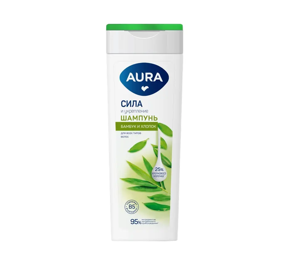 Шампунь AURA Сила и укрепление идеально подходит для всех типов волос. Бережно очищает кожу головы и укрепляет волосы по всей длине, придавая им особую силу и прочность. ЭКСТРАКТ БАМБУКА придает волосам больше упругости, увлажняет, тонизирует и укрепляет структуру волос, стимулируя их рост. ПРОВИТАМИН В5 восстанавливает поврежденную структуру волос, глубоко питает и разглаживает их. ХЛОПКОВОЕ МОЛОЧКО легко проникает в структуру волос, нежно ухаживает за ними и придает особую мягкость и блеск. Шампунь на 95% состоит из ингредиентов натурального происхождения. Благодаря АКТИВНОЙ ФОРМУЛЕ ТРОЙНОГО УХОДА волосы становятся сильными и крепкими при его регулярном использовании. Для наилучшего эффекта рекомендуем использовать вместе с бальзамом AURA Сила и укрепление.