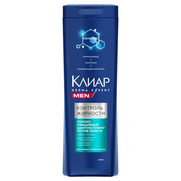 Клиар Men Derma Expert Контроль жирности — мужской шампунь-пилинг против перхоти с комплексом ниацинамида, пантенола и салициловой кислоты. Средство глубоко’ очищает, оказывает ухаживающий эффект и обеспечивает видимый результат: свежесть без перхоти с первого применения’’! Подарите вашим волосам качественный уход и чувствуйте себя увереннее вместе с шампунем от перхоти мужским от бренда Клиар: • Формула средства разработана с учетом особенностей мужской кожи головы и оптимально подходит для жирных волос у корней. • Компоненты шампуня мужского для жирных волос обеспечивают эффективное очищение, активацию естественного защитного слоя скальпа и мягкое удаление перхоти, а также питают и увлажняют кожу головы и волосы. • Средство имеет физиологический для кожи pH и подходит для регулярного применения. • Шампунь-пилинг для кожи головы обладает приятным ароматом и оставляет ощущение свежести. Мужественный аромат шампуня раскрывается сочными цитрусово-фруктовыми нотами, переходящими в аккорды лаванды и сандалового дерева, в основе композиции – мускус, амбра и древесные нотки.