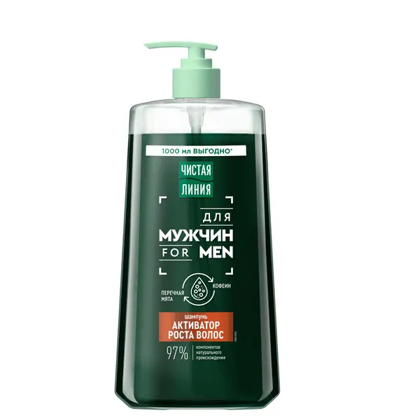Шампунь мужской для волос Чистая линия ДЛЯ МУЖЧИН с перечной мятой и кофеином – это эффективное средство, которое обеспечивает вашим волосам и уходу за кожей головы. Мужской шампунь-активатор роста волос на 97% состоит из компонентов натурального происхождения. Шампунь питательный, изготовленный на основе указанной формулы с учетом особенностей мужских волос и кожи головы. Мужской шампунь для волос с мятой и кофеином не содержит силикона. Очищающий шампунь для волос с перечной мятой и кофеином в составе обеспечивает комплексный уход за локонами и волосами. Шампунь Чистая линия для мужчин с перечной мятой и кофеином стимулирует рост волос, делая пряди сильнее от корней до кончиков. Шампунь для укрепляющих волос дает видимый результат уже после первого применения: локоны становятся на 45% более сильными. Шампунь для мужчин Чистая линия не является лекарственным средством. Чистый шампунь мужской для роста волос 1000 мл – это выгодная* покупка. Шампунь-стимулятор роста волос Чистая линия ДЛЯ МУЖЧИН – это средство формирования больших волос, которого хватит надолго, что также Вам понравится