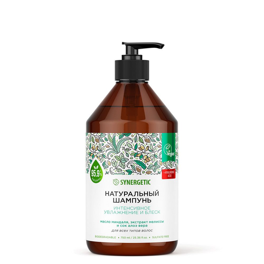 Бессульфатный шампунь SYNERGETIC «Интенсивное увлажнение и блеск» — эффективное средство для очищения кожи головы и всех типов волос — более чем на 98% состоит из натуральных компонентов.Шампунь деликатно очищает, эффективно ухаживает за волосами и защищает кожу головы. Формула с гиалуроновой кислотой оказывает комплексное воздействие, эффективно увлажняет волосы и придает им здоровое сияние, не утяжеляя.Натуральный шампунь содержит комплекс масел миндаля, арганы , который восстанавливает, питает и увлажняет волосы по всей длине. Активные компоненты в составе шампуня укрепляют волосы и стимулируют восстановление кератиновых волокон. Сок алоэ вера и экстракт мелиссы придают волосам эластичность и блеск.Мультифункциональный компонент натурального происхождения софоролипид мягко очищает кожу головы и сохраняет естественный микробиом, а инновационный увлажняющий комплекс усиливает барьерные свойства кожи и обеспечивает до 72 часов глубокого увлажнения.Физиологичный уровень pH 5,5 устраняет сухость кожи головы и гарантирует безопасность при частом использовании средства даже для чувствительной кожи.Натуральный шампунь не содержит SLS, SLES, парабенов, силиконов, минеральных масел и красителей, а также компонентов животного происхождения, не тестируется на животных и сертифицирован британской организацией The Vegan Society. Знак Vegan — мировой стандарт этичной продукции.
