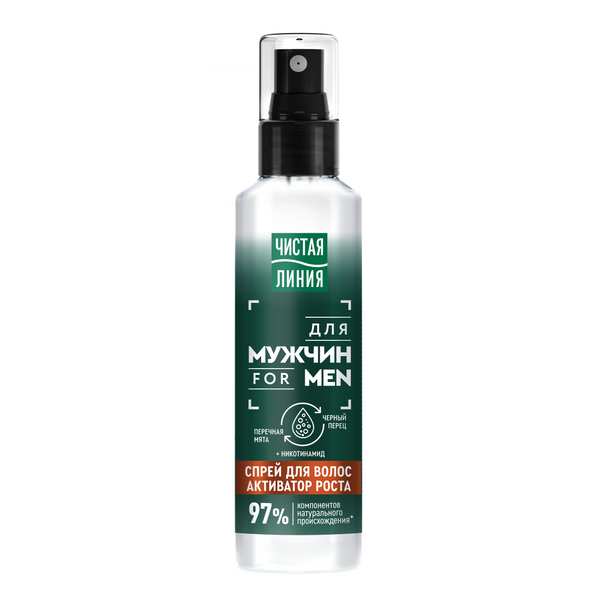 Зачастую мужчины сталкиваются с проблемой выпадения волос. Бренд Чистая Линия представляет новую серию продуктов, разработанную специально для мужчин. Для укрепления, активации роста волос и уплотнения их по длине, попробуйте эффективное средство – спрей для волос Чистая Линия. В составе спрея 97% компонентов натурального происхождения. • Никотинамид и черный перец в составе обеспечивают активацию роста волос и ультраукрепление'; • перечная мята – защиту от потери волос. Видимый результат°: на 45% более сильные волосы с первого применения. Клинически доказано°°: активация роста волос.