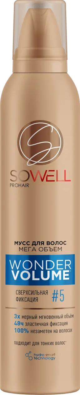 Невесомый мусс для волос SoWell «Wonder Volume» Мега объем с усовершенствованной формулой Hydro Smart Technology с легкостью поможет в создании супер объемной укладки, о которой мечтает каждая женщина, и придаст волосам ухоженный вид.Мусс уплотняет и делает волосы гуще, обеспечивает длительную, достаточно гибкую фиксацию. Сохраняет естественный вид и подвижность волос без склеивания.