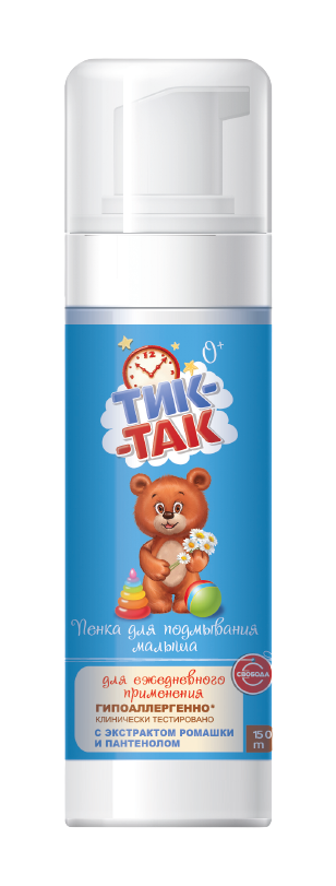 Пенка для подмывания малыша «Тик-Так» идеально подходит для ежедневного применения. Продукт прошел клинические испытания и получил категорию «гипоаллергенно».