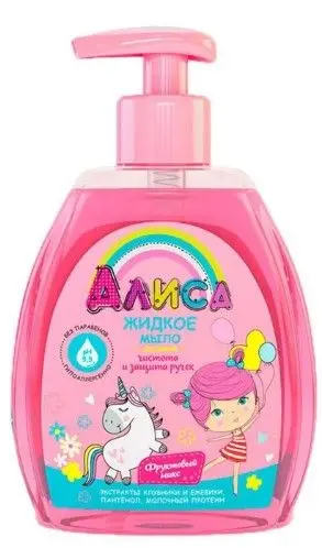 Жидкое мыло Алиса имеет мягкую моющую основу и нейтральный уровень pH, поэтому бережно очищает нежные ручки, сохраняя кожу мягкой и увлажненной. Экстракт магнолии обладает антибактериальным эффектом и обеспечивает природную защиту от бактерий. Экстракты клубники и ежевики, пантенол и молочный протеин питают кожу, защищая ее от сухости и раздражения. Жидкое мыло рекомендовано для детей с 2-х лет.
