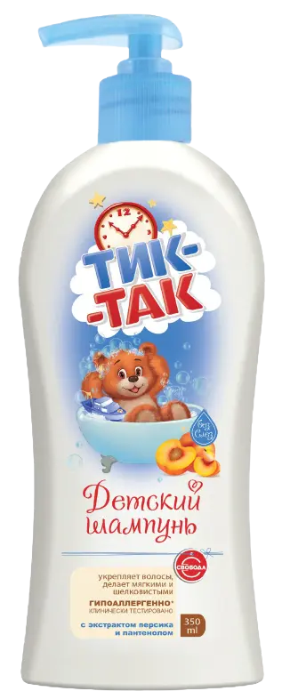 Детский шампунь Тик-так с экстрактом персика укрепляет волосы и делает их мягкими и шелковистыми.