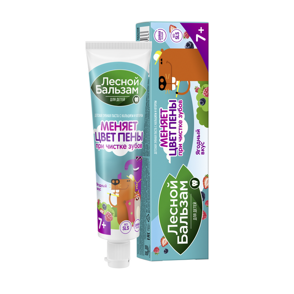 Детская зубная паста Лесной бальзам с 7 лет исполняет мечты каждой мамы! Это первая зубная паста, меняющая цвет пены в процессе чистки зубов. Поможет воспитать правильную привычку чистки зубов с раннего возраста. А главное проверить, почистил ли ребенок зубы – теперь намного легче! Особенности формулы: 1) Зеленые капсулы в составе зубной пасты постепенно раскрываются во время чистки и меняют цвет пены с белого на зеленый, превращая чистку зубов в увлекательное занятие! 2) Цвет пены меняется постепенно: чем дольше ребенок чистит зубы, тем сильнее пена приобретает зеленый оттенок и тем качественнее проведена чистка зубов 3) Формула с двойным кальцием укрепляет эмаль зубов, способствует правильному созреванию эмали и делает ее до 2 раз плотнее 4) Натуральный антибактериальный комплекс на основе экстракта магнолии защищает от образования налета и развития кариеса 5) Содержит биоактивный фтор для усиления антикариесного эффекта 6) Ягодный вкус с умеренной интенсивностью освежения 7) без SLS, безе SLES 8) Зубная паста для детей Лесной бальзам 7+ разработана совместно со стоматологами и протестирована на кафедре детской стоматологии, не оказывает раздражающего или токсического воздействия на полость рта. Более того в пасте используется специальный мягкий пенообразователь с минимальным воздействием на слизистую полости рта. 9) Безопасна при случайном проглатывании