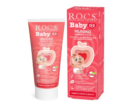 Уникальная зубная паста ROCS Baby Нежный уход. Яблоко разработана специально для ухода за полостью рта малышей, начиная с первых месяцев жизни. Она изготовлена на основе природных компонентов, а натуральный ароматизатор придает пасте нежный вкус свежего яблочного пюре, который понравится ребенку и сделает ежедневную гигиену ротовой полости приятной. Паста для зубов R.O.C.S. Baby Нежный уход. Яблоко не содержит фтор, красители, искусственные отдушки, парабены и лаурилсульфат натрия; она безопасна при проглатовании и обеспечивает комплексный уход за деснами и молодой эмалью в период прорезывания первых (молочных) зубов.