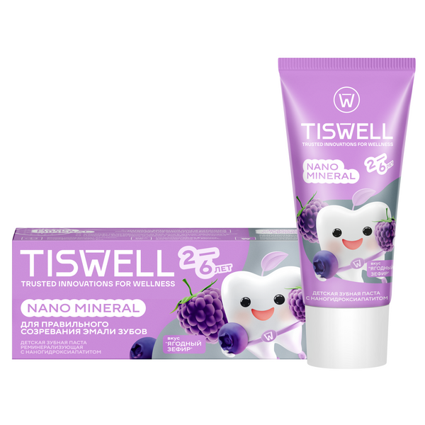 Tiswell зубная паста детская реминерализующая от кариеса с наногидроксиапатитом и фтором ягодный зефир от 2–6 лет 60 гр