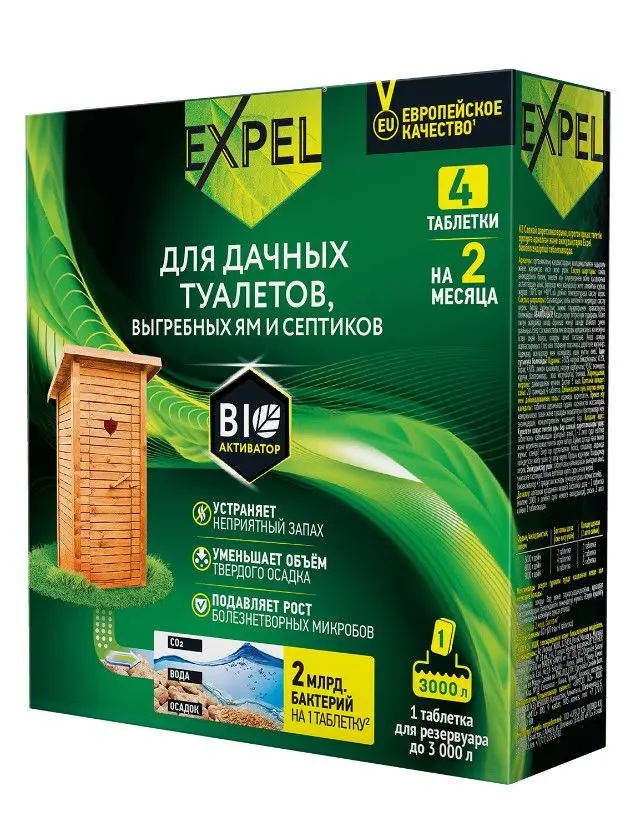 Чтобы отдых на даче запомнился только приятными моментами, стоит заранее позаботиться о покупке качественных эффективных средств по уходу за дачным туалетом или септиком.Представляем современное решение в уникальном инновационном формате двуслойной таблетки – Биоактиватор EXPEL. Таблетка EXPEL для дачного туалета и септика содержит энзимы и концентрированные бактерии, которые разлагают фекальные массы на воду, углекислый газ и соли, тем самым обеспечивая бесперебойную работу. Максимальный показатель – 2 млрд. бактерий на 1 таблетку!Доверьтесь европейскому качеству EXPEL. Закажите биоактиватор для комфортной жизни на даче и в доме! • Устраняют неприятный запах• Уменьшают объем твердого осадка• Подавляют патогенные микробы• Удобство и простота применения• Экономичный расход: 4 таблетки = 8 недель использования• Европейское качество