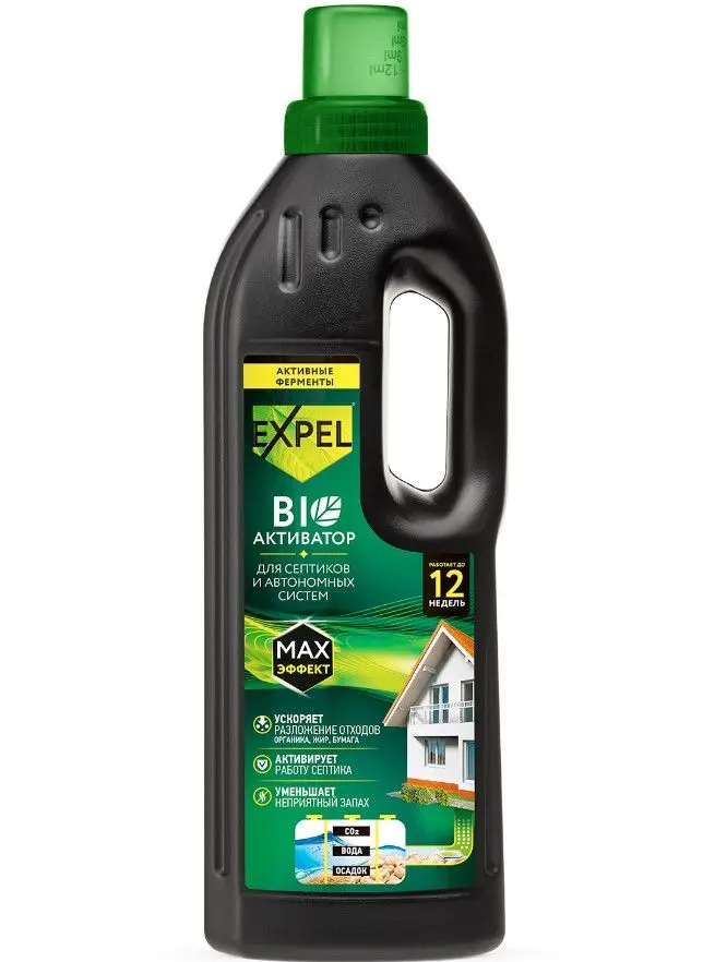 Если вы – счастливый обладатель загородного дома или дачи, позвольте нам сделать ваше пребывание там максимально комфортным.Жидкий биоактиватор EXPEL для септиков и автономных систем на основе активных ферментов выведет ваши системы утилизации и переработки органических отходов на новый уровень эффективности.Композиция энзимов активирует работу септика и ускоряет переработку органических отходов – белков, жиров и пр. Оптимально подобранный для анаэробных условий септик-танка состав биоактивных компонентов подавляет неприятный запах, уменьшает объём твёрдого осадка и снижает потребность в автоассенизации.Важно заметить – в отличие от жидких биоактиваторов на основе бактерий, формула Expel позволяет с удовольствием использовать продукт, который будет эффективен на протяжении всего срока годности!3 месяца активной работы септика или вашей автономной системы – гарантия EXPEL!• Активирует работу септика • Ускоряет разложение белков, жиров и других отходов• Уменьшает объем твердого осадка• Уменьшает неприятный запах• Снижает потребность в автоассенизации• 3 месяца активной работы