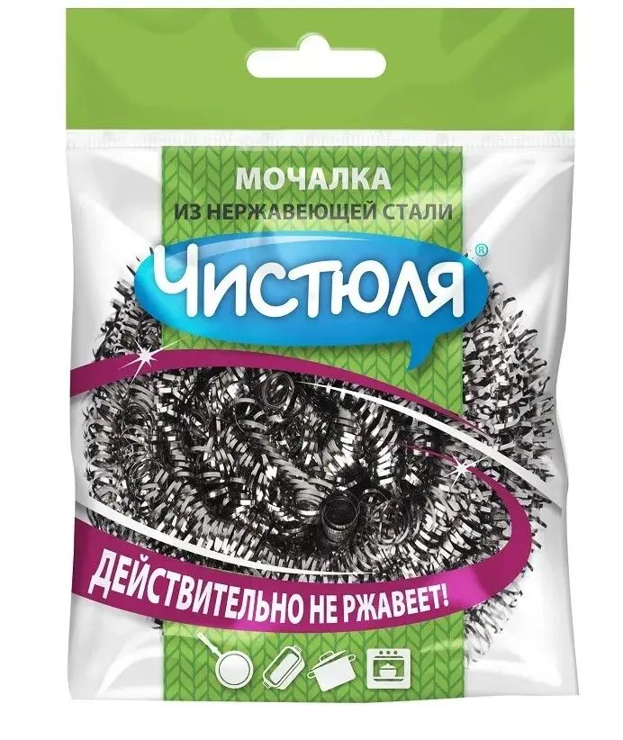 Мочалка Чистюля металлическая из нержавеющей стали 1 шт предназначена для чистки противней, грилей, казанов, чугунных сковород и другой кухонной утвари для жарки от сильных загрязнений, нагара.