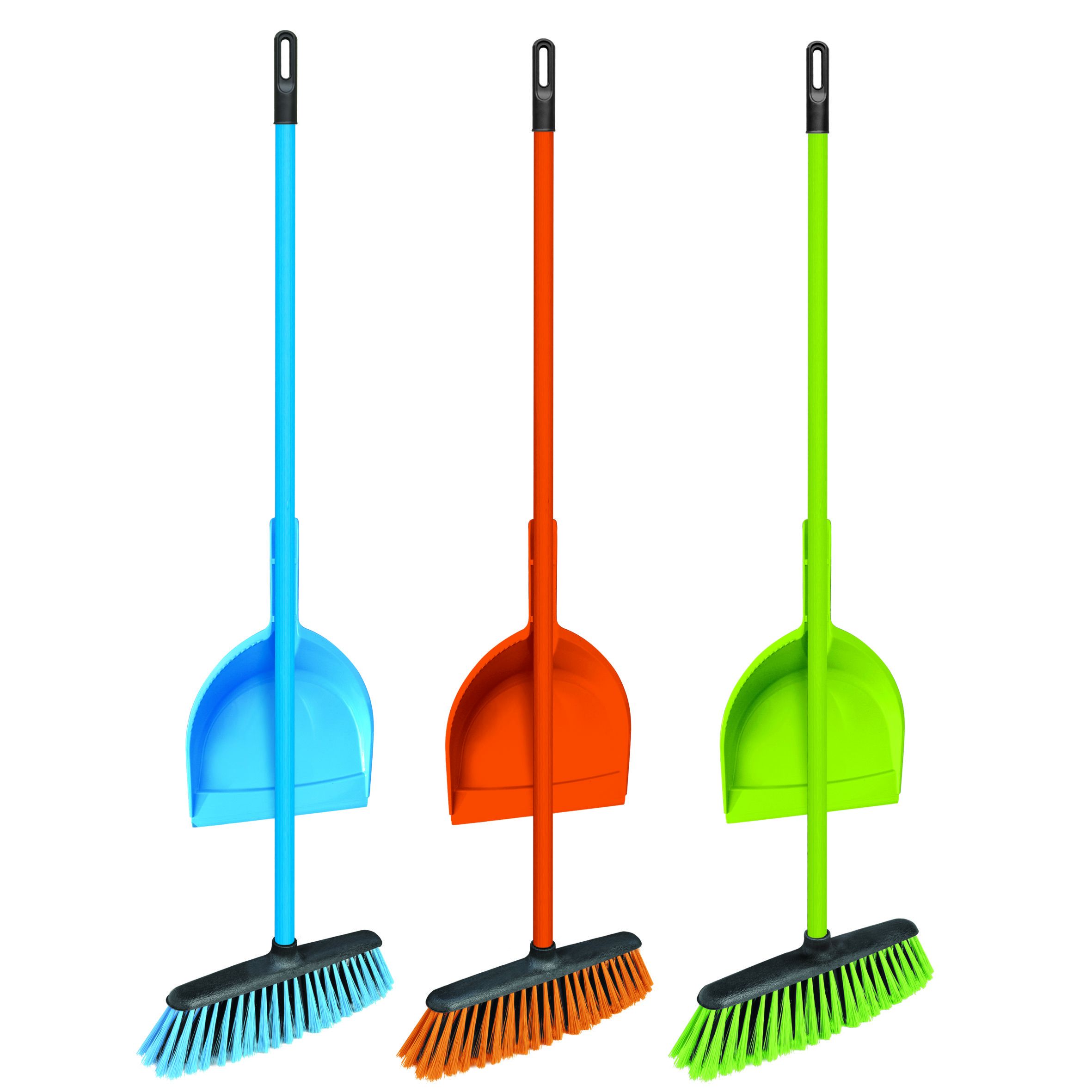 Комплект состоит из щетки, совка и рукоятки. Угол крепления щетины специально подобран так, чтобы было удобно подметать большие площади. Система "клик" позволяет крепить щетку с совком на рукоятке и облегчает хранение набора.
