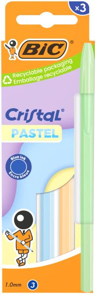 Шариковая ручка BIC® Cristal® Pastel имеет корпус и колпачок, окрашенные в модные пастельные оттенки. Упаковка из 3 шариковых ручек BIC® Cristal® Pastel с 3 цветами корпуса (голубой, персиковый и зеленый). Средний пишущий узел диаметром 1 мм пишет синими чернилами линии шириной в среднем 0,32 мм. Шарик в пишущем узле BIC® Cristal® Pastel доведён до совершенства, поэтому чернила подаются равномерно и письмо становится лёгким и мягким. Тот же фирменный шестигранный корпус, что и у оригинальной ручки BIC® Cristal®.