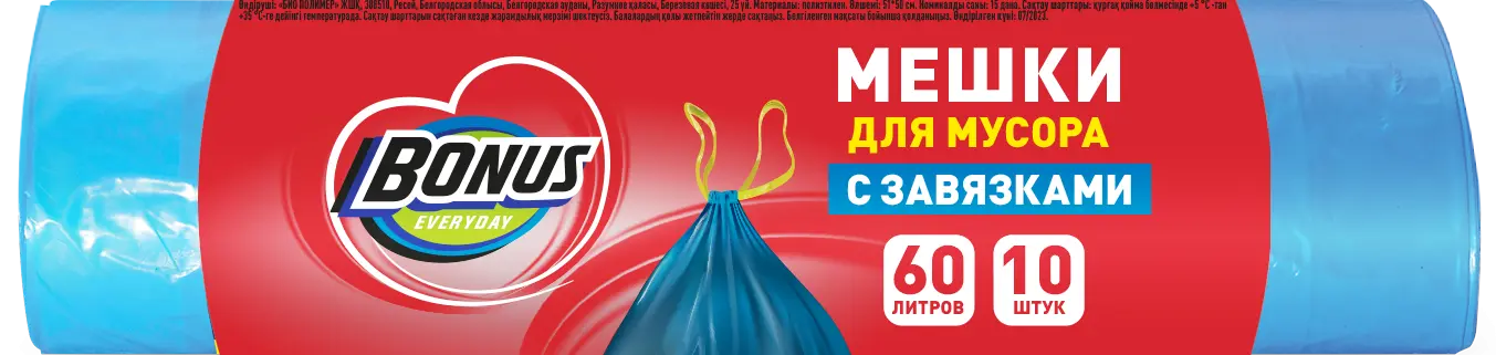 BONUS пакеты для мусора с затяжками hd 60*64 см 60л 10 шт синие